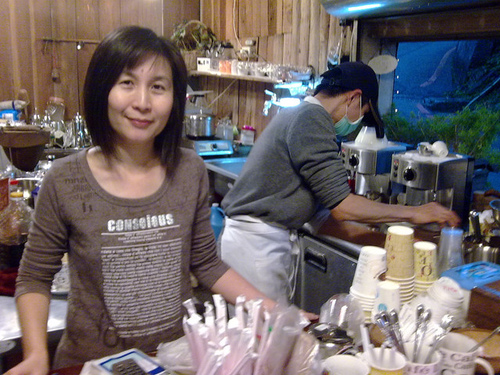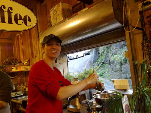我做比較簡單的工作,磨咖啡加上裝填咖啡粉。有時候幫忙倒牛奶到拿鐵咖啡,或洗洗碗盤。等得久的客戶,朝著我就開始點,我都叫他們去找小娟媽,免得弄亂了。