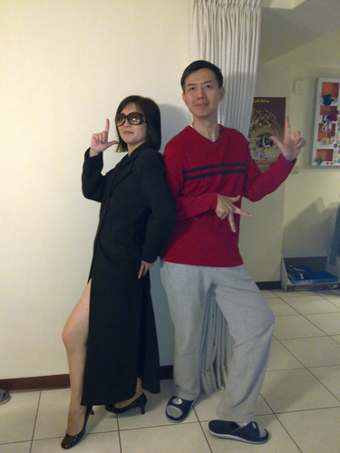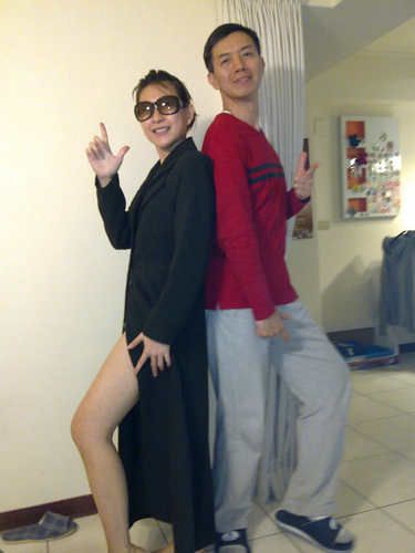 中場休息時間,小娟媽突然神氣地亮出一件黑黑的長大衣,穿起來活像駭客任務的道具服。這下怎麼得了,姊妹倆開始人來瘋了起來,戴起墨鏡,擺起酷酷帥帥的姿勢,撩露出白白淨淨的大腿,猛照相,然後爭搶著看手機拍出來即時的"笑"果,然後一起笑得趴在地上不停地拍打抽搐。