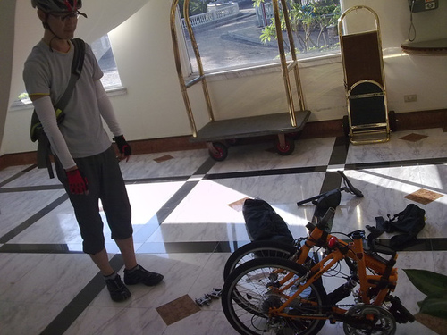 在Lobby遇到一位日本人,他被日本總公司派駐到竹科工作,雖然每個月依然需要往返台灣跟日本之間,但顯然是長時間住在這個飯店。這部小摺他花兩萬在台灣新買的(在物價騰貴的日本,他應該覺得很超值吧!),計畫每星期六、日到附近騎腳踏車運動一下。