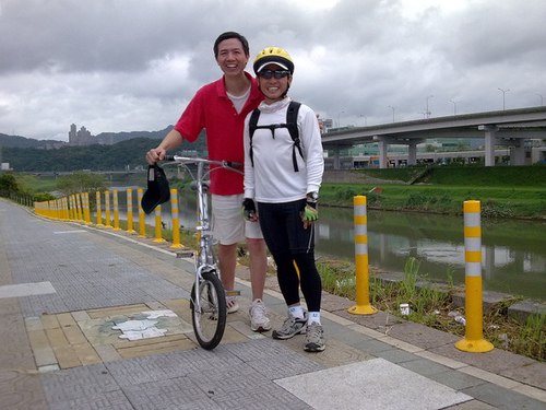 他們今天早上從北投騎到汐止這裏來,還一派輕鬆的說他們經常一早就騎去大溪吃豆乾,然後折返,好像從客廳走到廚房端出一杯咖啡來喝那麼容易。徐先生說,前一陣子才參加台東的鐵人賽回來 (按: 奧運的鐵人三項是: 1. Swin: 1.5 KM within 50 min; 2. Bike: 40 KM within 100 min; 3. Run: 10 KM, within 70 min,考驗參賽者的耐力與毅力) ,現在他正在訓練徐太太鐵人賽,他說就快要學成了。我猜徐先生應該是約莫約四十多歲,他爽朗的笑了出來,揮著結實的二頭肌說,我五十七歲了,真是有點給他看不出來。徐太太可能是因為夫唱婦隨地經常運動,身材保持得十分曼妙,我還一度以為徐先生是和辣妹出遊了,一開始還小心的問他"請問這位是…..",他爽朗的說,我老婆啦! 他還說,訓練鐵人三項可是依照老婆的要求做的,他是被他老婆拖著來運動,陪公子讀書!