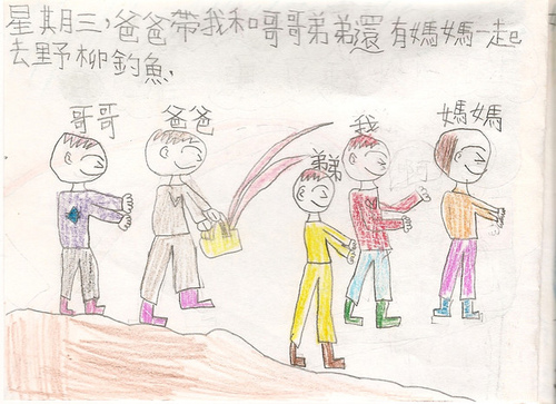 第一頁: 星期三,爸爸帶我和哥哥弟弟還有媽媽一起去野柳釣魚。