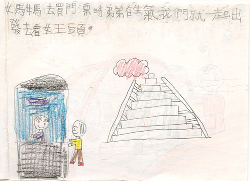 第二頁: 媽媽去買門票時弟弟在生氣我們就一起出發去看女王頭。