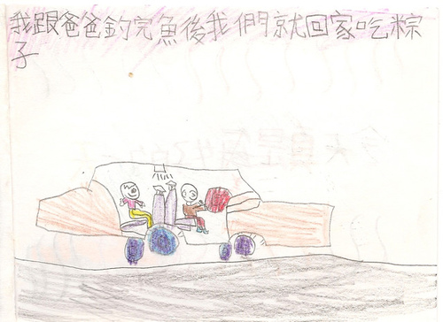 第四頁: 我跟爸爸釣完魚後我們就回家吃粽子。