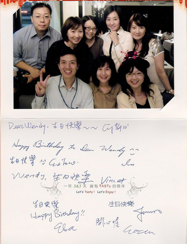 小娟媽以前的老同事們,熱烈響應購買 T shirt 來贊助成功管樂社成果發表會,大夥約在復興北路的Tasty 聚會,除了交換無關緊要的公司八卦之外,最主要還是給可愛的 Wendy小公主來慶生,然後順便發發Tshirt。