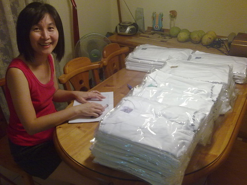 小平設計的管樂聯T今天終於到貨了,前前後後小娟媽總共義賣了一百多件,要依照愛心的團體別,分裝去發貨。