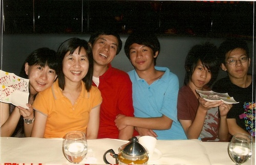 小阿姨再過幾天也生日,所以也一起慶祝,Tasty送來兩份甜點,兩位工作人員來跟我們一起唱生日快樂歌。可惜他們以有些客戶不喜歡為由,取消了喜感可愛的生日蠟燭高帽,後來說有墨鏡道具,找了半天竟說已經被客戶弄壞了,壞了一些些興致。還好大夥很隨和,工作人員也很賣力幽默的化解尷尬,還算是做到了賓主盡歡。三隻小豬不太愛照像,我也知道他們不想讓人看到他們長痘子的青澀樣子,只是我還是不時不識相的突襲,他們難免感到不快,真希望他們能了解,我只不過是想為他們留下一些青春印記的紀錄,供他們長大後涕下憑弔罷了! 慶生後,Tasty 要為我們合照並印出相片給我們留念,他們只好勉為其難的敷衍配合一下,只是前前後後照了五次才成,因為總是有人想在按下相機快門的剎那閃躲,可是怎麼都躲不過工作人員細心的法眼。
