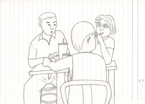 接下來五分鐘,他們靜默了下來,爸爸專心把漢堡吃完,小孩吃著薯條沾滿紅紅的番茄醬、大口大口吸著可樂,媽媽則皺著眉若有所思的啜飲著咖啡。