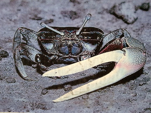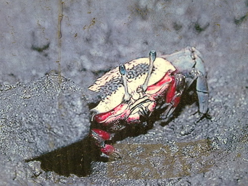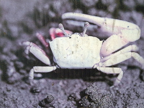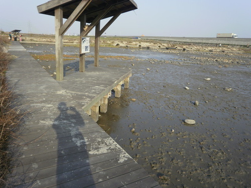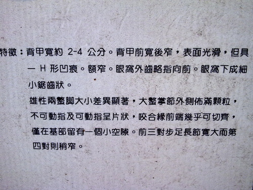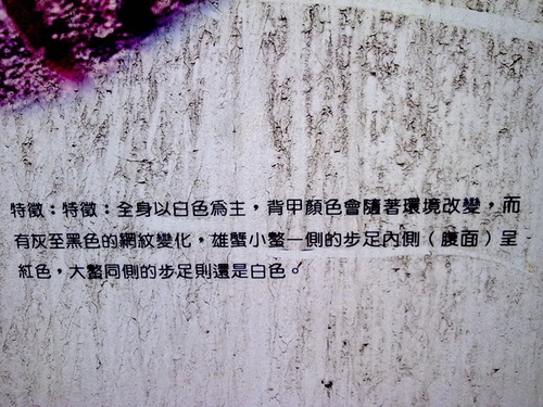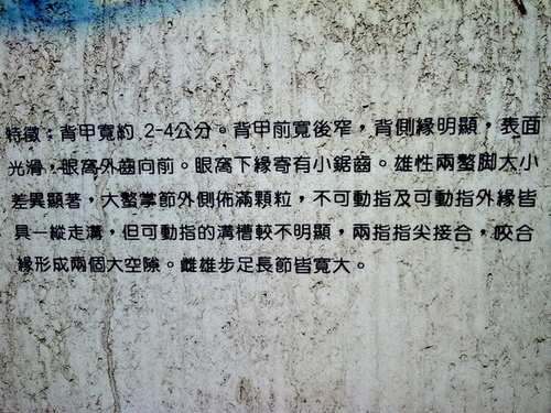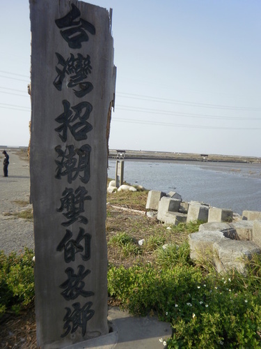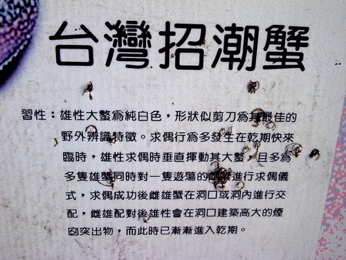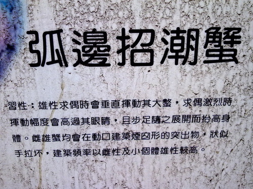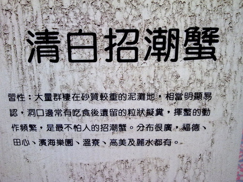 海風很大,鴨舌帽都戴不住,太陽固然很大,風吹起來還是覺得很冷。在海邊的舊魚塭,設置了觀賞招潮蟹的步道與亭子。偶爾有白鷺鷥飛來啄食,招潮蟹一聽到腳步聲就迅速躲進預先挖好的沙洞裡,久久就是不肯出來。我們覺得冷久站不得,所以只能遠遠觀看到招潮蟹慌張的身影。池邊倒有一些說明。