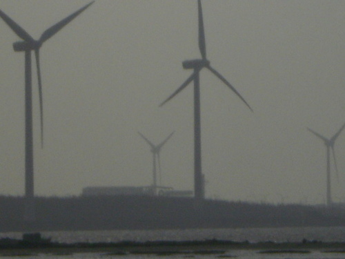 在伸港鄉的海邊,建了不少風力發電的風車,這節能減碳的訴求,與將魚塭改成招潮蟹觀賞池來吸引觀光,互相呼應這時代潮流的趨勢,也讓人看到這小小鄉鎮在環境保育上默默的努力。只是海風很大很冷,吹得動風車,可能也吹走了觀光客,或許是我們來錯了季節而已吧!