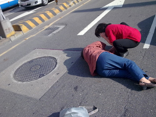 今天早上打完球,經汐止大同路二段,遇到一樁汽車撞人的意外。肇事者沒有逃離,迅速下車來查看。可能因為太緊張,說無法撥通119,我馬上幫忙撥通。肇事者非常緊張,一直問被撞倒的阿桑,是否聽到聲音,並叫她不要睡著。我告訴她不要動阿桑,要讓專業的救護人員來處理。後來阿桑神智稍醒,說出了家中的電話,肇事者撥完電話,用發抖的聲音說: 你媽媽被我撞倒在大同路上,請趕快來。