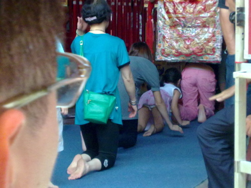 端午節期間,鹿港天后宮有一項十分特殊的祈福儀式。祈福的人從媽祖乘坐過的神轎下跪爬過去(躦轎腳),就會求得想要的平安與幸福。小平也耐心與其他善男信女一起排隊,加入祈福的行列。我和小娟媽也打從心底祝他一切順利平安。