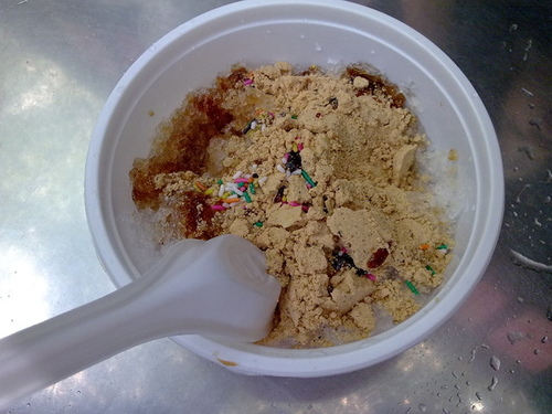 更妙的是這麵茶居然可以加在剉冰上面,在這炎炎的端午,吃起來相當消暑。(小娟則叫熱的,吃起來分明就是米仔麩的味道嘛。)