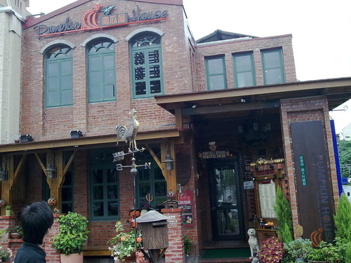 這家南瓜屋餐廳,外牆用傳統的紅磚疊砌而成,增添很多復古懷舊的感覺,配上藍綠色的拱形窗戶,潔淨中居然把現代感也融合了進來。門口鐵製的公雞形風向計,木製信箱,守候的忠狗,南瓜燈與布偶,讓人不禁想起西片中的美式鄉間的生活格式,只是店家的佈置多了異國情懷的溫馨少了田野的蒼涼,是該把胃交給他們的時候。
