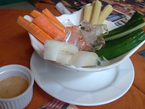 沙拉用冰鎮,吃起來十分清脆爽口。店家特別推薦其中白色的叫樹薯,吃起來是一種沒有特別味道的味道,有一點像把酸甜味抽離後的豐水梨,這麼中庸的口味,想必是對養生有特別的奇效,除了好奇的人會嚐嚐,愛重口味的小孩蜻蜓點水式的吃上一小口,就已經很了不起了。我印象裡的生的樹薯是有毒的,小時候經常幫忙從泥土中挖起,採收削成細絲曬乾,是餵豬的上料。不知是否是同一種東西。