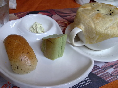 前餐提供香水麵包與標榜對身體環保的抹茶口味,搭配酥皮南瓜湯,味道堪稱一絕。