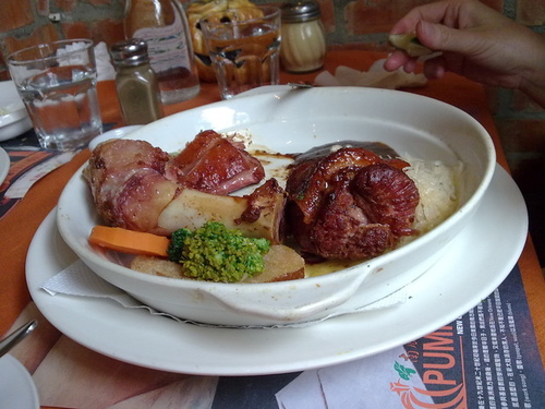 小娟媽吃味道濃重的德國豬腳。